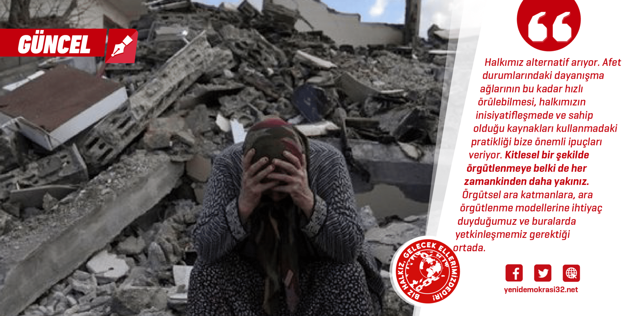 Tüm bu olgusal gerçekler karşımıza iki temel gerçeği çıkarıyor: Birincisi, emperyalizme yarı bağımlı, montaj sanayiden ibaret ve yağma-talan sistemine dayalı inşaatçı devletin özünde, bir savaş makinası gibi çalışan, İHA’lar, SİHA’lar üreten ve bu anlamda en muktedir ve en perçinlenmiş iktidara sahip görüngünün altında yatan, haftalardır halka çadır bile götüremeyen güçsüzlüğün çelişkisi vardır. Ülkemizin gerçekliği “devlet baba”dan “nerede bu devlet?”e sürekli geçişlerle doludur. Bu gerçeklik bizi ikinci gerçeğe götürmektedir: ülke aynı zamanda bir konjonktürler yığınıdır da. Bu yığın halkasına belki 99’da değil ama şimdi eklenen yeni bir konjonktürel gerçekliğimiz var: Deprem.
