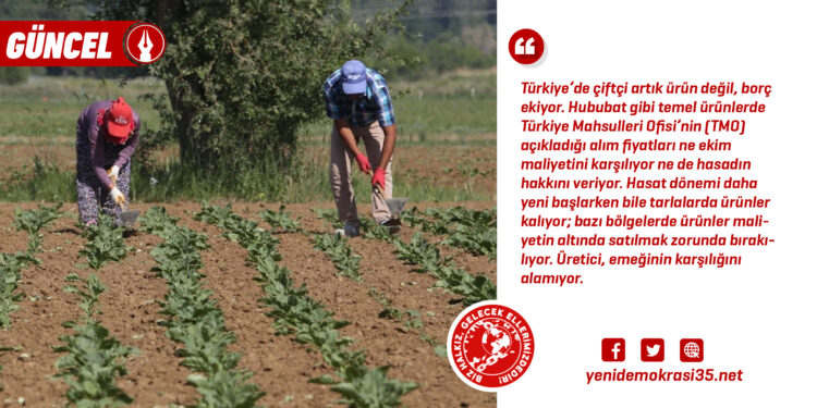 Bu tablo net: Türkiye’de çiftçi artık ürün değil, borç ekiyor. Hububat gibi temel ürünlerde Türkiye Mahsulleri Ofisi’nin (TMO) açıkladığı alım fiyatları ne ekim maliyetini karşılıyor ne de hasadın hakkını veriyor. Hasat dönemi daha yeni başlarken bile tarlalarda ürünler kalıyor; bazı bölgelerde ürünler maliyetin altında satılmak zorunda bırakılıyor. Üretici, emeğinin karşılığını alamıyor.