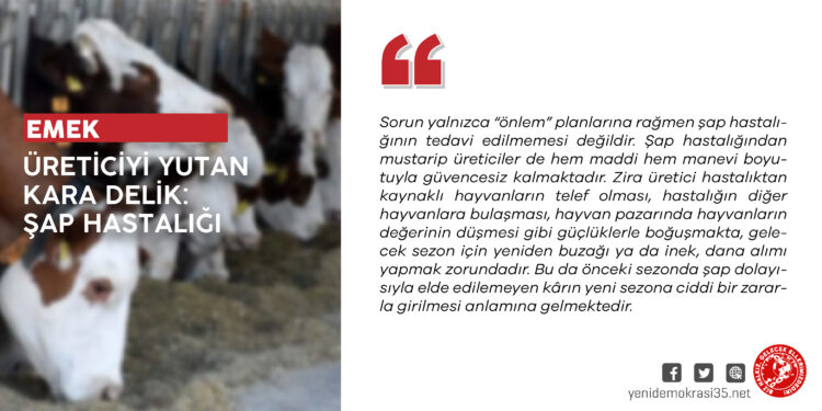 Türkiye’de süt ve kırmızı et gibi hayvansal ürünlerin fiyatlarının pahalı olması ve sürekli artmasından dolayı hayvan yetiştiricilerinin sorunları, hayvancılıkta dışa bağımlılık gibi konular sık sık gündeme gelmektedir. Son dönemde küçükbaş hayvanlara ve çoğunlukla büyükbaş hayvanlara zarar veren şap hastalığı borç yükünden kurtulamayan üretici açısından daha da vahim bir tabloya yol açıyor. Baş edilemeyen şap hastalığı şu anda birçok bölgede yaygınlaşmış, hayvan pazarları ise 1 Temmuz’dan itibaren kapanmış durumda. Henüz soruna çözüm bulunamamış, üreticilerin ahırlarında hastalık dolaşırken ithal hayvanlar satın alınarak üretici bataklığa terk ediliyor.