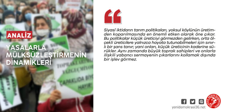 Mülksüzleştirme olgusu, küçük ya da orta köylülüğün yalnızca üretimden koparılması değildir. Bu süreç, devletin doğrudan müdahalesiyle, zorbalığın hukuki düzenlemelerle hayata geçirildiği; büyük toprak sahipleri ve onların ilişkili olduğu yabancı sermayenin kollandığı bir zeminde yaşanmaktadır. Mülksüzleşme, Türkiye kapitalizminin doğal dinamiklerinin bir sonucu değil, büyük toprak sahipleri ve esas olarak yabancı sermayenin ihtiyaçları doğrultusunda gerçekleşmiş, sürecin tamamlanmasında devlet önemli bir aktör olmuştur.