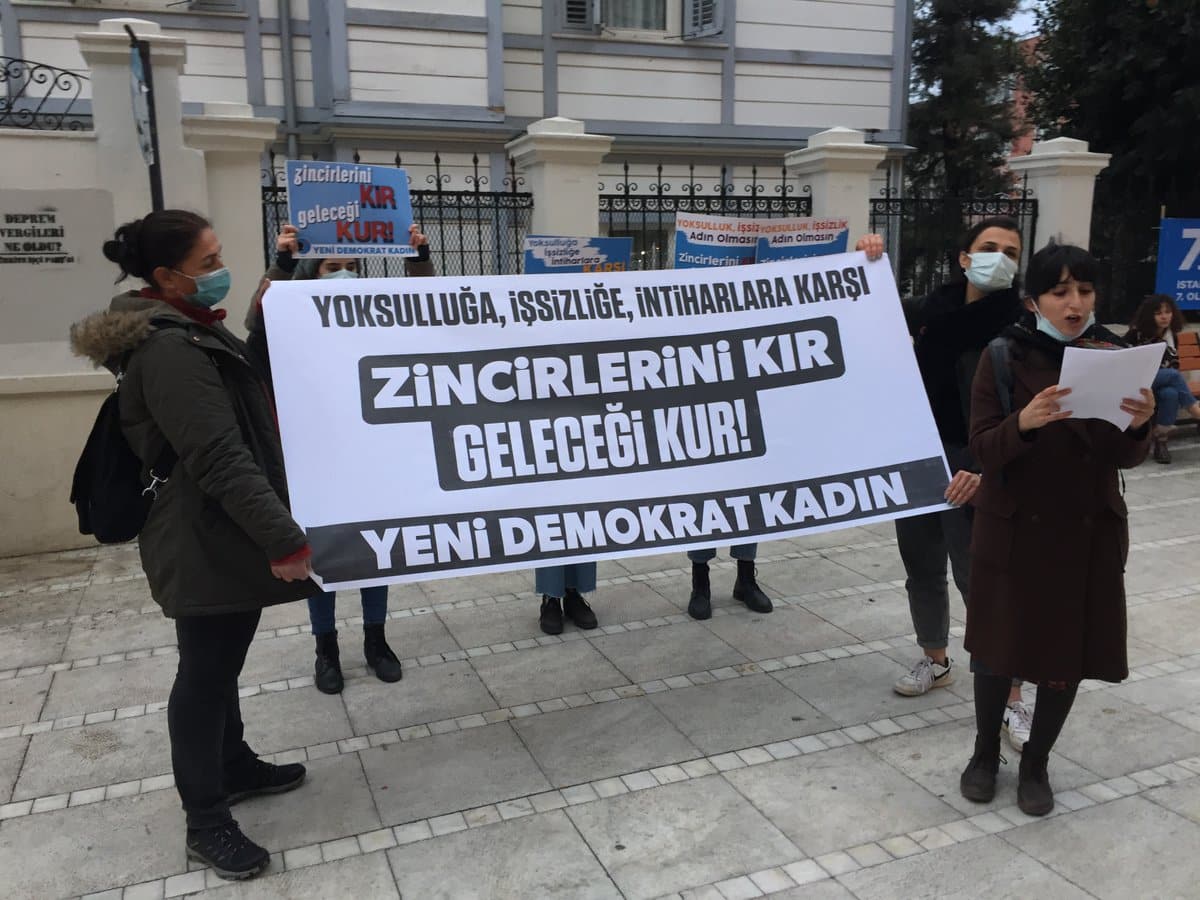 Yeni Demokrat Kadın, Kadıköy’de bulunan Süreyya operası önünde yaptığı basın açıklaması ile ekonomik kriz nedeniyle artan intiharlara dikkat çekti. Polis ablukasında gerçekleşen açıklamada, “Yoksulluğa, İşsizliğe, İntiharlara Karşı Zincirlerini Kır Geleceği Kur“ pankartı açılırken, “Zincirlerini Kır Geleceği Kur“ dövizleri taşındı. Açıklamada sık sık “Kadın cinayetleri politiktir“, “Kadınlar sokağa özgürleşmeye” sloganları atıldı.