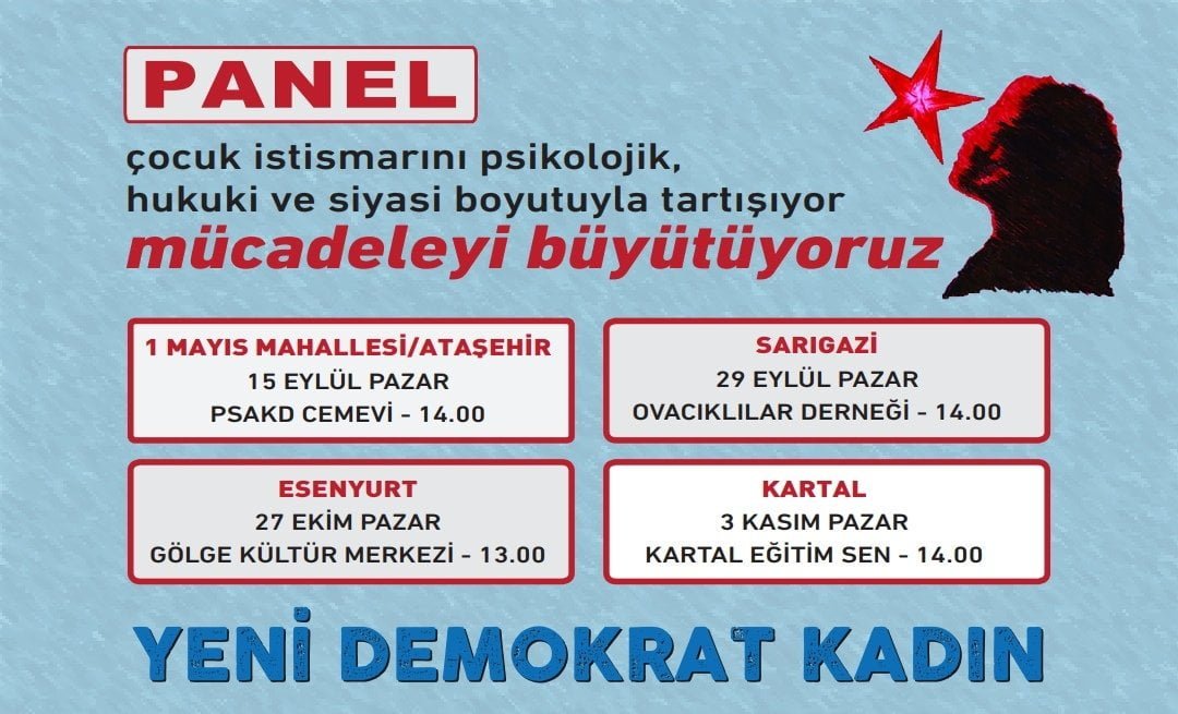 Çocuklara yönelik işlenen suçların her geçen gün arttığını, caydırıcı cezaların olmadığını, istismar ve ihmal başta olmak üzere çocuk işçiliği, eğitim, sağlık, barınma haklarının gasp edildiğini tüm çocukların özgür, eşit haklardan faydalanmadığını, beslenmeden tutalım da çocukların tüm yaşamını saran şiddet ve saldırının öncelikle geleceğimizi dinamitlediğini vurgulayan Yeni Demokrat Kadın çocuk istismarının ciddi boyutlara ulaştığını, araştırmalara göre her dört çocuktan birinin aile içerisinde cinsel istismara maruz kaldığını belirtti. Yeni Demokrat Kadın “çocuk istismarını psikolojik, hukuki ve siyasi boyutuyla tartışıyor, mücadeleyi büyütüyoruz” şiarıyla düzenlediği panellere çağrı yaptı: