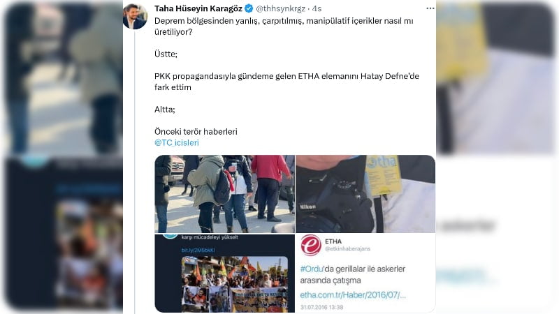 Karagöz, “Deprem bölgesinden yanlış, çarpıtılmış, manipülatif içerikler nasıl mı üretiliyor? Üstte; PKK propagandasıyla gündeme gelen ETHA elemanını Hatay Defne’de fark ettim. Altta; Önceki terör haberleri” paylaşımı yaparak İçişleri Bakanlığını etiketledi.