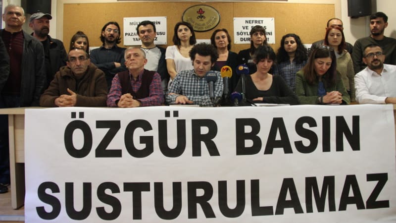 HABER MERKEZİ- Libya’da ölen MİT’çilerin haberi yapıldığı için tutuklanan Yeni Yaşam gazetesi Genel Yayın Yönetmeni Ferhat Çelik, Yazı İşleri Sorumlusu Aydın Keser ve Yeniçağ gazetesi yazarı Murat Ağırel için İHD binasında basın açıklaması yapıldı. Basın açıklamasına HDP milletvekilleri Züleyha Gülüm, Ahmet Şık, HDK Eş Sözcüsü İdil Uğurlu, Evrensel Genel Yayın Yönetmeni Fatih Polat, Türkiye Gazeteciler Sendikası Genel Başkanı Gökhan Durmuş, DİSK Basın İş YK üyesi Ali Ergin Demirhan ve çok sayıda kurum ve kuruluştan kişi katıldı.