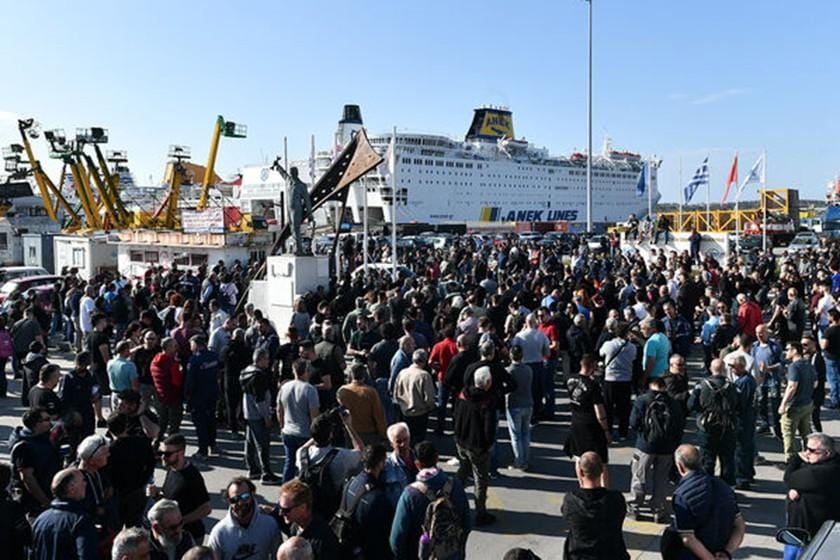 İşçiler, daha sonra geri dönerek Perama’da iş yoğunluğu ve güvenlik açıklarına karşı “Hayatlarımız değerlidir, biz ‘gider’ değiliz” pankartıyla protesto yürüyüşü gerçekleştirdi.