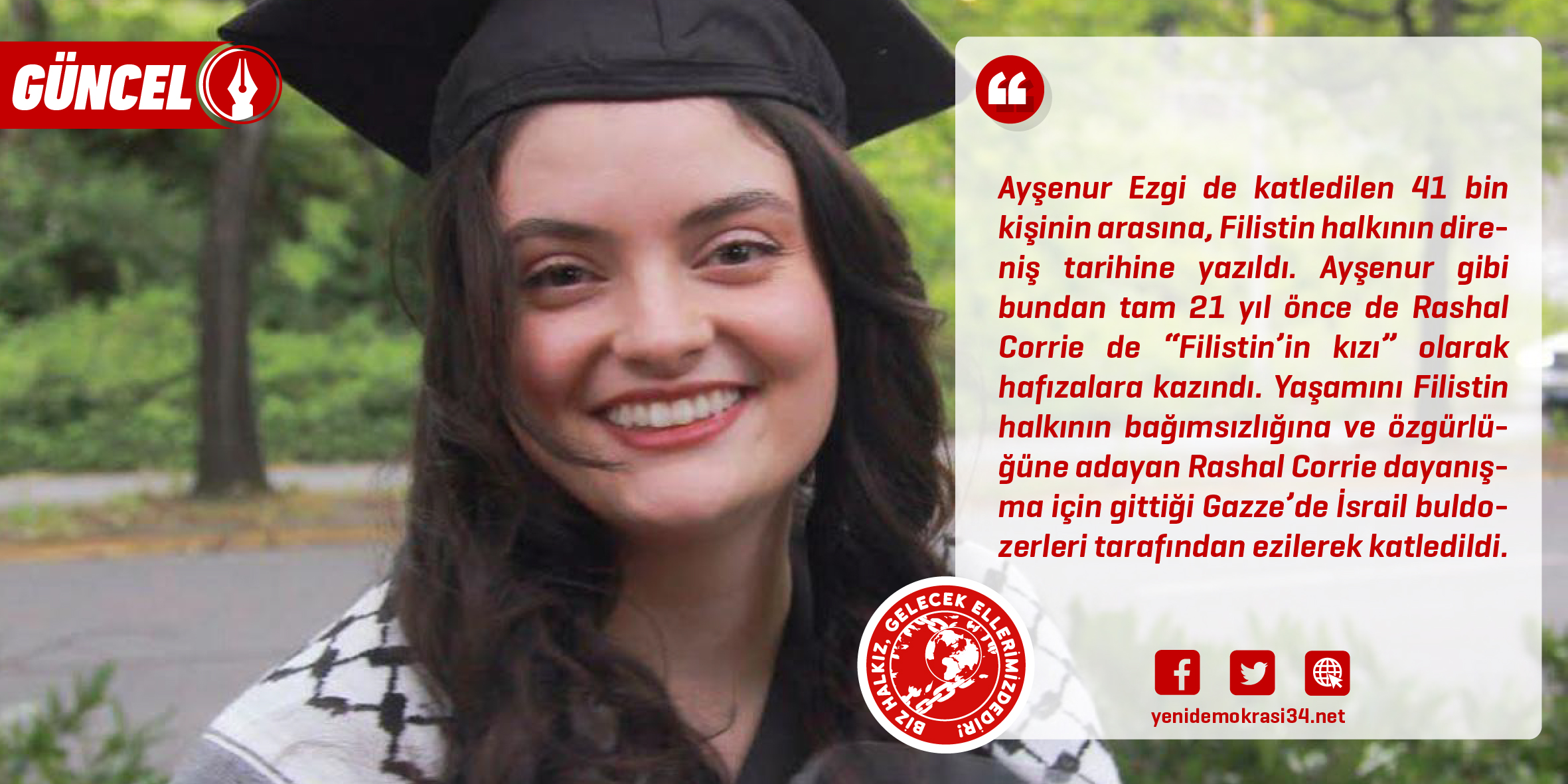 Ayşenur Ezgi de katledilen 41 bin kişinin arasına, Filistin halkının direniş tarihine yazıldı. Ayşenur gibi bundan tam 21 yıl önce de Rachel Corrie de “Filistin’in kızı” olarak hafızalara kazındı. Yaşamını Filistin halkının bağımsızlığına ve özgürlüğüne adayan Rachel Corrie dayanışma için gittiği Gazze’de İsrail buldozerleri tarafından ezilerek katledildi. Filistinliler Rachel için bu cümleleri kuruyor: “Filistinli ailenin evinin yıkımını engellemeye çalıştığı sırada İsrail buldozeriyle ezilerek hayatına son verildi. Ancak Corrie bizim için ölmedi, başta Gazzeliler olmak üzere her Filistinli için bir sembole dönüştü. Tabi ki her insan ölecektir. Rachel de öldü. Ancak bazı insanlar vardır ki ölürler ancak kendilerine halkların kalplerinde yeniden yer bulurlar. İşte Rachel böyle biri. Evet, İsrail’in Rachel’e ve Filistin halkına yönelik zulmü devam ediyor. Ancak Rachel’in ve Filistinlilerin bu zulme karşı mücadelesi devam edecektir.” Evet, mücadele devam ediyor ve edecek, Ayşenur da Rachel gibi Filistin halkının mücadelesinde yaşam bulacak.